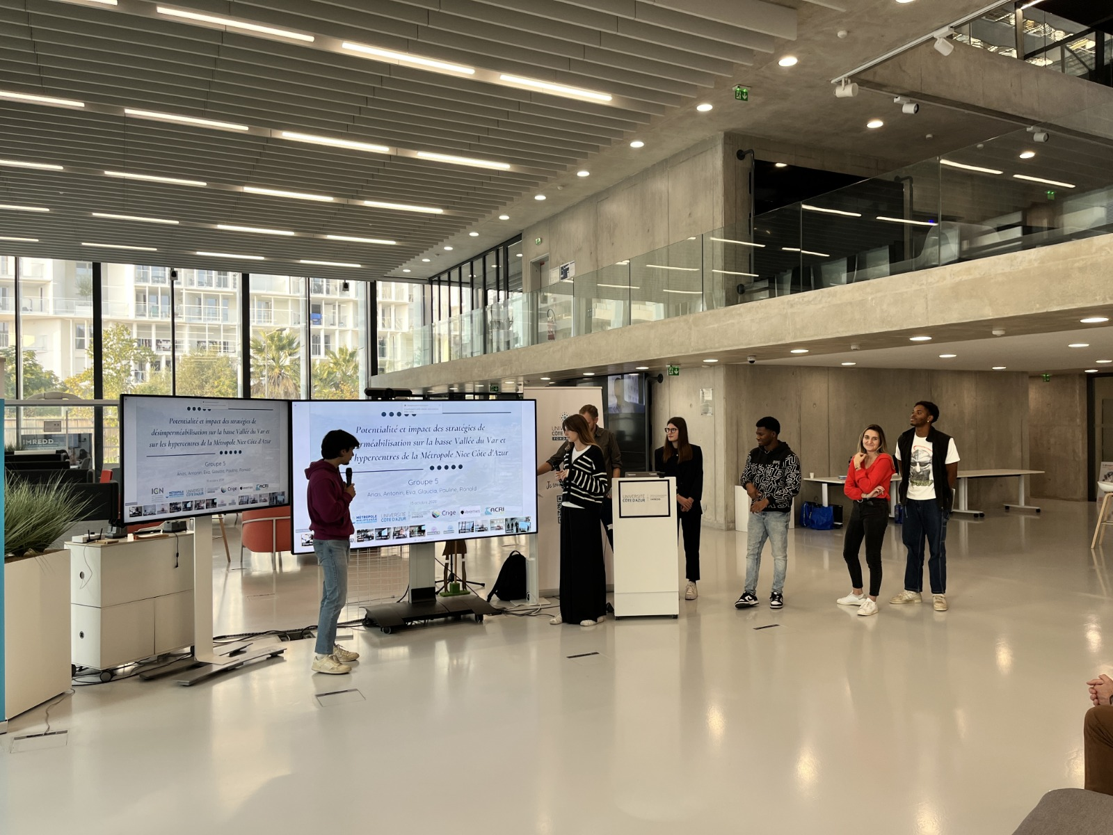 « Potentialité et impact des stratégies de désimperméabilisation sur la basse Vallée du Var et sur les hypercentres de la Métropole Nice Côte d’Azur », un sujet proposé par le Laboratoire GEOAZUR avec pour objectif d’automatiser la sélection de sites et techniques de désimperméabilisation des sols en se basant sur une analyse multicritère.Retour d'expérience du groupe 1 travaillant sur le défi n°1