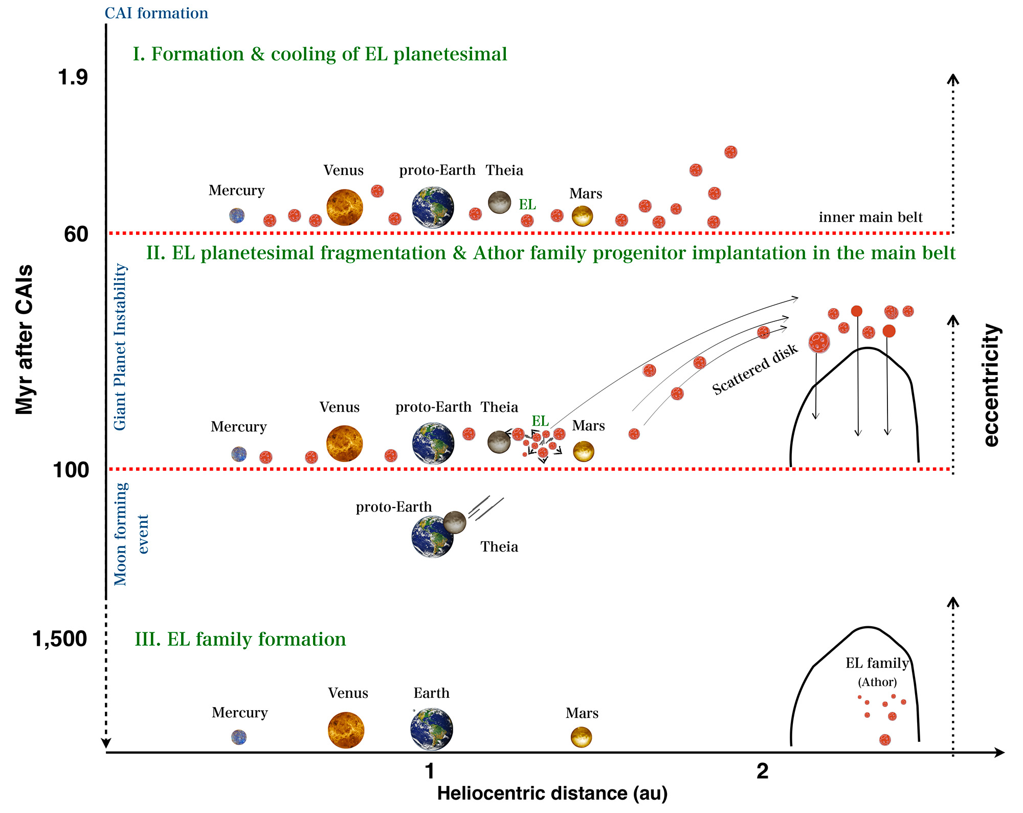 Les cercles rouges sont les planétésimaux et les fragments des planétésimaux qui se sont formés dans la région des planètes terrestres. La courbe noire indique approximativement la limite de la ceinture principale interne des astéroïdes. Chaque panneau montre l'évolution du Système Solaire interne à différents moments : Le panneau (I) montre la formation du planétésimal dont les météorites enstatite de type EL se sont formées. Au cours de cette période, les planètes telluriques ont commencé à disperser des planétésimaux sur des orbites à forte excentricité et avec des demi-grands axes qui correspondent à la ceinture principale d'astéroïdes. Le panneau (II) montre qu’entre 60 et 100 millions d’années après le début de notre Système Solaire, le planétésimal EL est fragmenté dans la région des planètes telluriques par un impact. Un fragment du planétésimal EL (l'ancêtre de la famille d’Athor) va être dispersé par les planètes telluriques sur une orbite qui croise la ceinture d’astéroïdes mais avec une forte excentricité. C’est à ce moment que l'instabilité orbitale des planètes géantes se produit. Cette instabilité perturbe l’orbite du fragment du planétésimal EL en diminuant son excentricité : l'ancêtre de la famille d’Athor est donc impacté par l’instabilité des planètes géantes dans sa position actuelle. Le panneau (III) montre que quelques dizaines de millions d'années après l'instabilité des planètes géantes, un impact entre l'embryon planétaire Theia et la proto-Terre conduit à la formation de la Lune. Finalement, 1500 millions d’années après la formation de notre Système Solaire l'ancêtre de la famille Athor a subi un impact qui forme la famille Athor que l’on observe aujourd’hui.